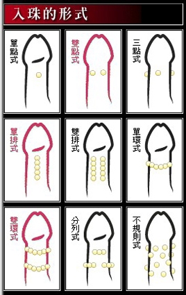 为满足男性患者不同需求,该技术入珠的形式是多样的,可分为单点式、双点式、单排式、双排式、单环式、双环式、分列式、不规则式等多种款式,可任由男性进行选择。不过要注意的是入珠少要四颗,这样可形成上、下、左、右一个圆。